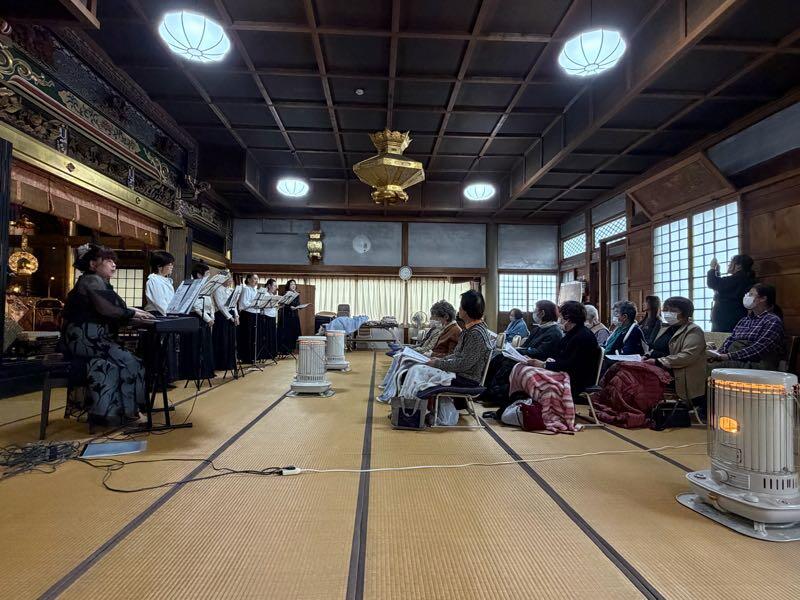 水橋地区のお寺さんを会場にして、水橋組の門徒総代会で正信偈の練習会を行いました。